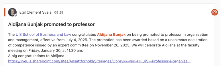 Hello, my name is Aldijana Bunjak Associate Professor of Management & Organization Linkedin Envelope 01. Check out my research work Google Scholar ResearchGate ORCID 02. Courses I teach Leadership and Organization Creativity and Organizational Behaviour Contemporary Human Resource Management Introduction to Academic Writing 03. Latest posts on blog and projects BlogadminJanuary 16, 2026My 5 Minutes of Fame (Kind of…)BlogadminDecember 11, 2025Looking Back, Moving ForwardBlogadminOctober 22, 2025A Special 73rd Anniversary Celebration